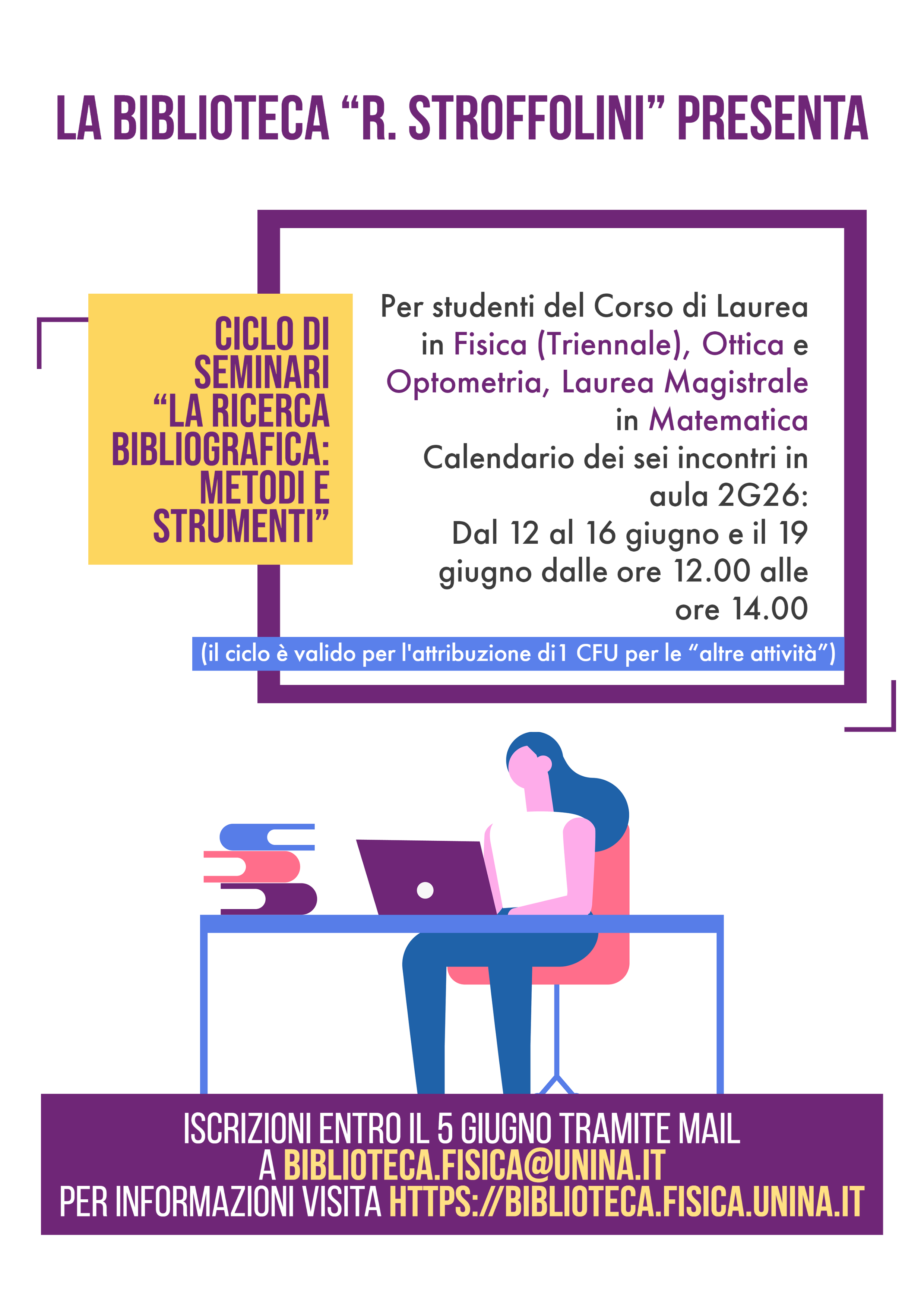 Il ciclo di seminari a cura della Biblioteca "Roberto Stroffolini" del Dipartimento di Fisica "Ettore Pancini" offre un percorso teorico e pratico per rafforzare le abilità nella ricerca bibliografica e nell'utilizzo dei servizi della biblioteca digitale dell'Ateneo, che potrà risultarvi utile anche per l'elaborazione della vostra tesi di laurea.